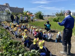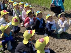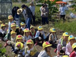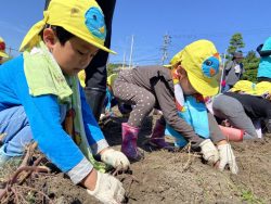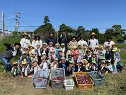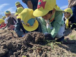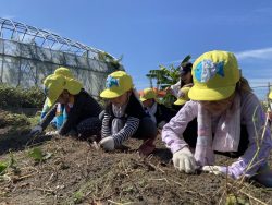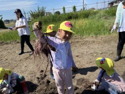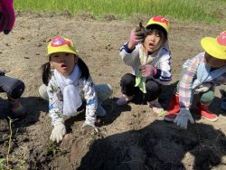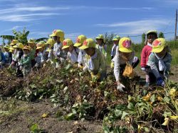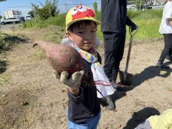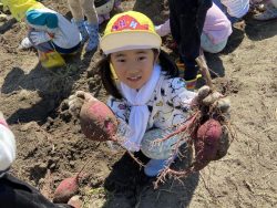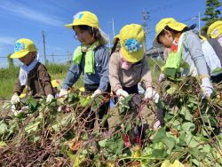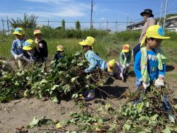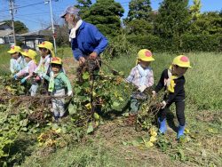 さつまいも畑を前にして、「うわ!すごい!」「草だらけだ!」と驚いていた様子。お手伝いに来てくださったPTA運営委員のお父さんやお母さんが、鎌をつかって蔓の根元を切ってくれるのを時っと見守りながら、足元ではねるコオロギやミミズにも目を奪われていた子ども達でした。そこからは、子ども達の出番!みんなで蔓を運びんだあとはいよいよおいもを掘り出しました。ちょっとだけ顔を見せているおいもを見つけて、お父さんたちの手も借りながら掘っていくと、大きいおいもや小さいおいも、ほそーいおいも…出てきたおいもを嬉しそうに見せてくれました。猛暑続きの気候のせいか、あまりたくさんのおいもは出てきませんでしたが、子ども達は体験できたことが嬉しかったようです。帰りのバスの中で、「おいもが出てきた時嬉しかった!」「どんなおいもが出てくるかわくわくしたよ!」「上手に掘れるかドキドキした。」「掘った時に、ポキッて折れちゃって残念だった…」「てんぷらにして食べたい!」等々、いろいろな声が聞かれました。
