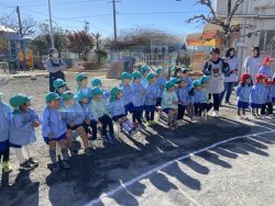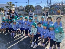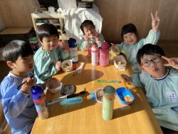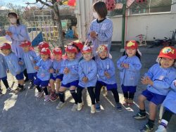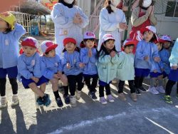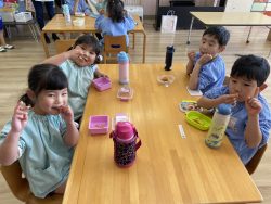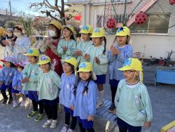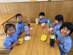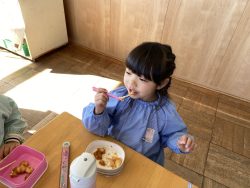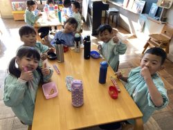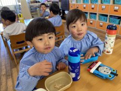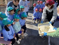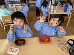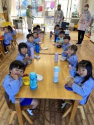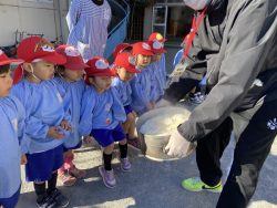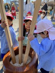 もち米をふかして、ご飯が炊けたときのようないい匂いがしたら、いよいよおもちつき!こづきの様子を応援したり、きねでつきはじめると自然に「よいしょ‼」の掛け声が子ども達からわきあがります。最後は子ども達の出番。子ども用の杵で順番につきました。おもちにすいつく杵を持ちあげるのに苦労している様子もあり、真剣な表情がかわいらしかったです。出来上がったお餅はピカピカツルツルでとってもきれい!きなこもちにしてみんなでいただきました。「あったかくておいしい!」「のびたー!」と大喜びでいただきました。