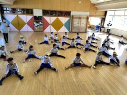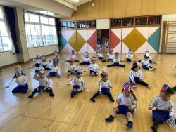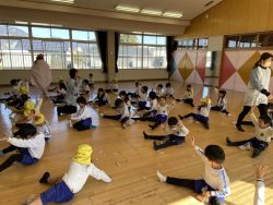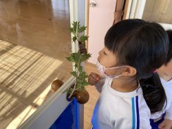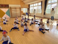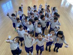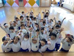 節分について話を聞いたあと、先生達の劇を見ました。『泣き虫鬼』や『風邪ひき鬼』など悪い鬼が出てきて幼稚園の子ども達に悪い病気を移そうとするところを福の神様のパワーと豆まきのパワーでやっつけました。そこで、子ども達も『おにはーそと!ふくはーうち!』と元気なかけ声をかけながら豆まき&お菓子拾いをしました。子どもなりに自分をみつめて、『負けたらすぐ泣いちゃうオニをやっつけたい!』『はずかしがりの鬼をやっつける!』など、いろいろな声が聞かれました。